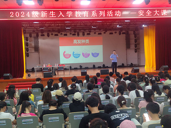 首先他从打架斗殴,酗酒滋事、远离毒品,不参与赌博,危害国家安全、参与非法宗教组织等几种大学生常见的违法违纪行为进行普法教育。紧接着从平安合肥、反诈有我开始讲起,为同学们讲述了反诈工作的复杂性、严峻性、顽固性。对比分析了近三年来我市特别是高校电诈发案率情况,重点为同学们介绍了大学生高发电诈案件的类型:刷单、网上购物、冒充同学和熟人、游戏装备网上交易、交友诈骗。希望新同学们檫亮眼睛、谨防受骗。最后杨础提醒同学们要牢记不要成为“两卡(银行卡、手机卡)”犯罪的被动承受者,不要成为电诈分子的“工具人”。杨础宣讲语言精炼、通俗易懂,深入浅出、诙谐幽默,不时引发同学们阵阵的掌声。