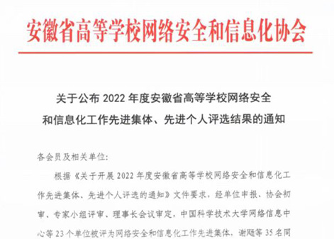 - 2023-01-12必赢教师荣获安徽省高等学校网络安全和信息化工作先进个人称号