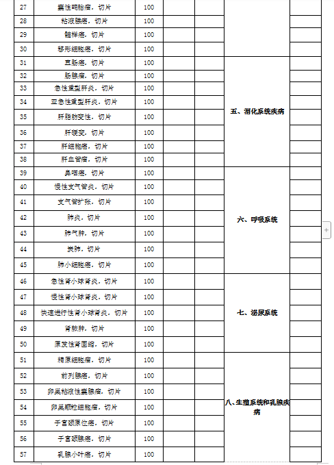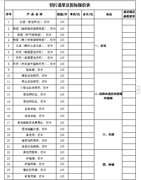 二、招标内容: 切片清单及报价表