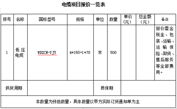 投标方应将电子投标文件、电子投标书、加盖公章扫描,文件名为“电缆采购项目电子报价文件”。将电子投标资料直接送至:861230741@qq.com邮箱。