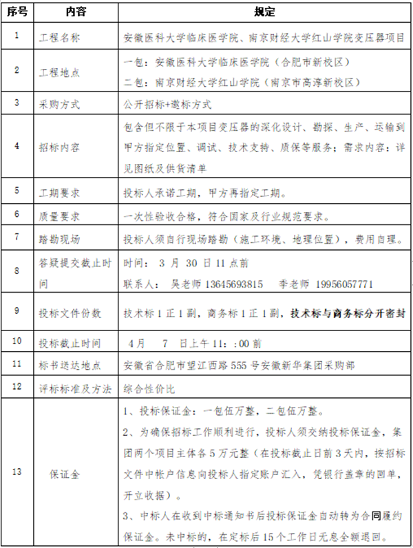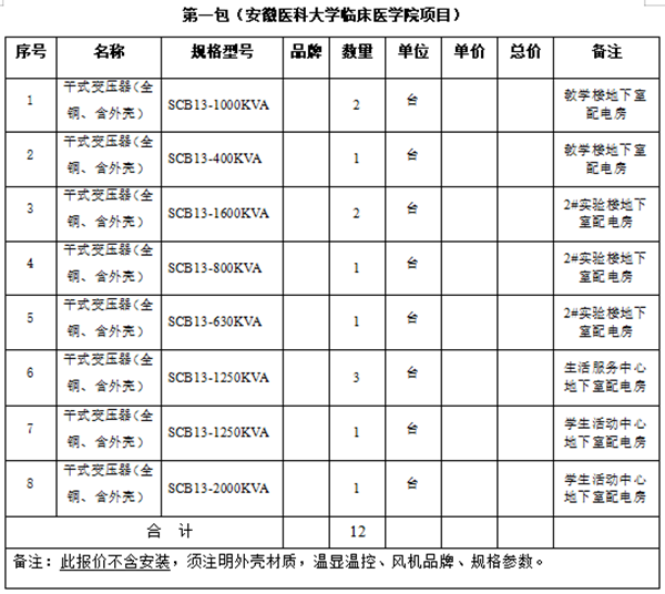 因单位需求,现对安徽必赢集团旗下院校,安徽医科大学临床医学院(合肥市新校区)、南京财经大学红山学院(新校区)所需变压器项目进行公开招标采购,欢迎全国符合条件的厂家及大型集成商前来报名参与。