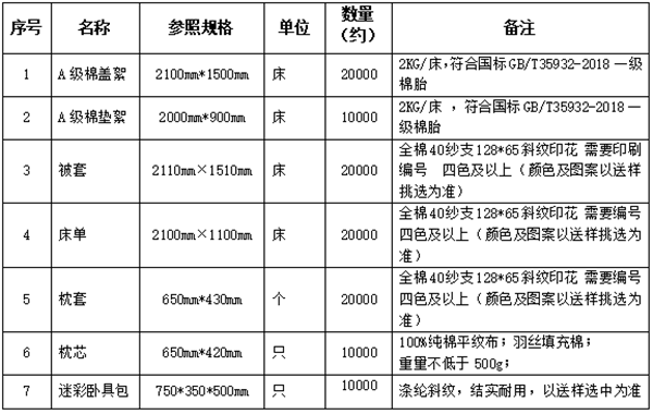 需提供样品(封样验货),样品及大货需全新产品,各项技术指标符合国家标准或行业标准。样品至少三款,需具有选择性,不可仅送一款(棉絮除外)。