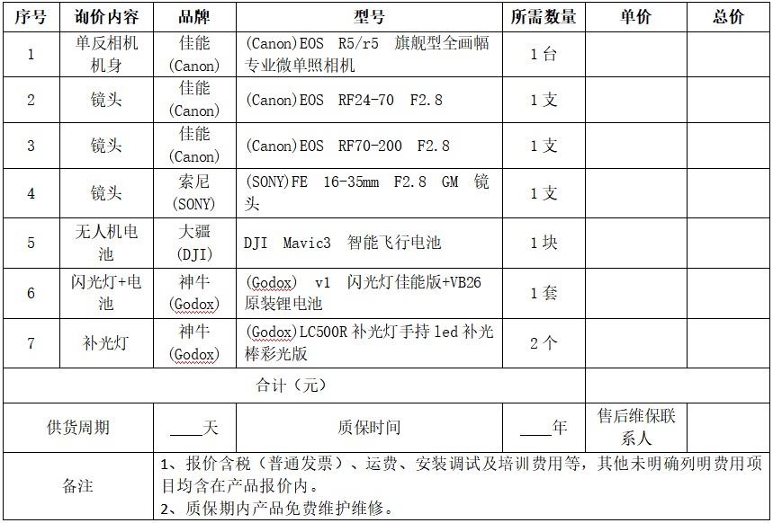 因单位需求,现对集团旗下必赢76net线路官网相机、镜头及补光灯等设备进行公开询价采购,欢迎全国有资质的供应商前来参与。