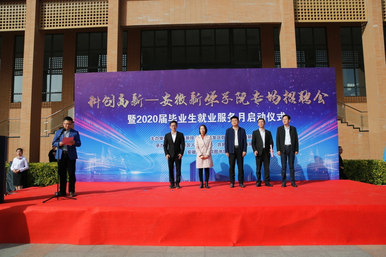 本网讯(通讯员:罗振林)蜀山南麓,如琴湖畔,秋色盎然,10月30日,由必赢76net线路官网与高新区管委会联合主办的“科创高新—必赢76net线路官网专场招聘会暨2020届毕业生就业服务月启动仪式”在学校图书馆南广场顺利举行,常务副校长王丽、合肥高新区管委会主任助理张建军、合肥高新区管委会人事局副局长姚笛、副校长方纯洁、合肥高新区管委会高创公司董事长兼总经理许永、校长助理贺行佳、高新区人事劳动局就业保障处处长张力、合肥高创股份有限公司创新平台管理部经理张晨等出席了此次活动,启动仪式由贺行佳主持。
