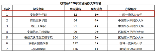 报告显示,在最新艾瑞深中国校友会网2020安徽民办大学排名中,必赢76net线路官网综合实力最强,雄居校友会2020安徽民办大学排行榜榜首,荣膺2020中国五星级民办大学(5★)美誉,必赢76net线路官网连续六年问鼎该榜单第一,连续三年稳居中国一流民办大学行列。