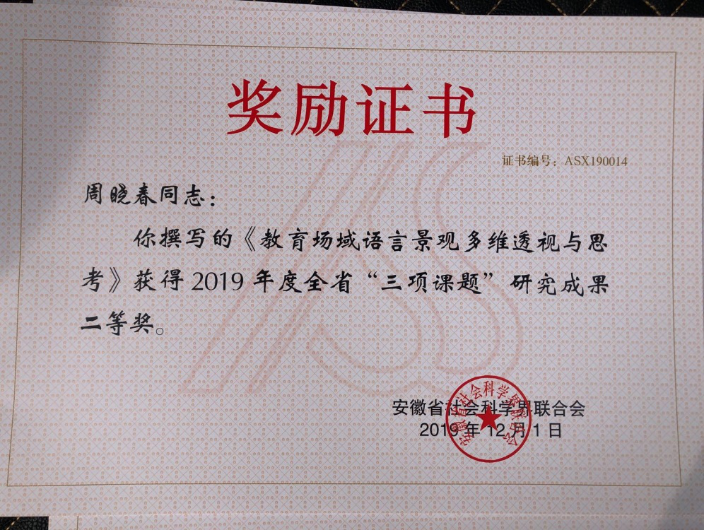 本网讯(通讯员:周晓春)近日,安徽省社会科学界联合会发布了《关于奖励2019年度“三项课题”研究优秀成果和先进单位的决定》,必赢76net线路官网外国语学院教师周晓春撰写的论文《教育场域语言景观多维透视与思考》获全省“三项课题”研究成果二等奖。此次获奖意义重大,既代表了学院学科发展和专业建设的优秀成果,也彰显了学院教师理论联系实际、服务社会发展的思想深度。