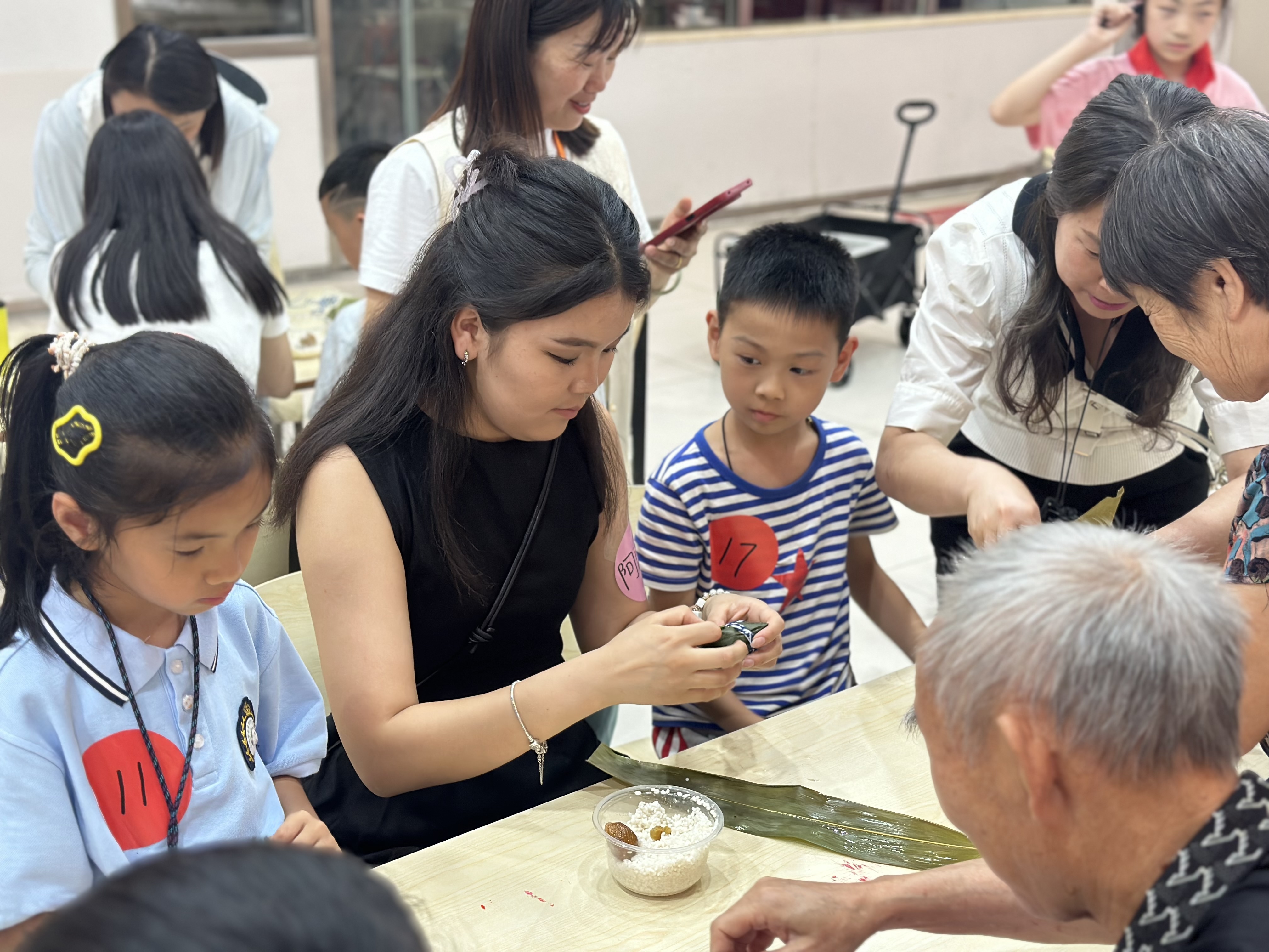 在包粽子体验环节,留学生与社区家庭分组合作,中国家长耐心示范,留学生们认真学习折粽叶、填糯米、捆扎粽绳的技巧。活动现场还设置了“创意粽子评比”,评选出“最佳造型奖”“最具国际风味奖”等趣味奖项,大家热情高涨,笑声不断。