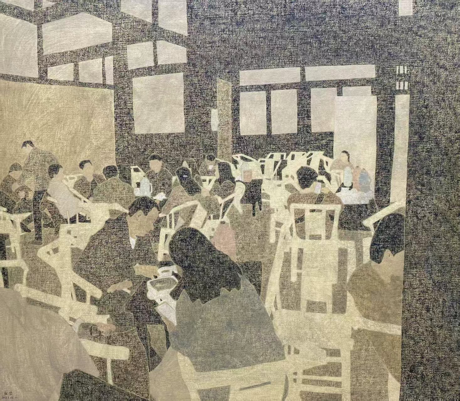 作品《小城故事系列五》以独特的艺术视角,通过一条纵深的小巷将观者视线引向新旧建筑交织的天际线,以斑驳墙面与错落盆栽的细腻刻画,在怀旧氛围与生活气息间达成微妙平衡,生动展现了城乡变迁中的人居记忆。而《小城故事·茶馆生活四》则以传统茶馆为题材,用精湛的油画语言,生动捕捉了市井生活中的宁静瞬间与人文温情,画面构图错落有致,笔触细腻而富有韵味,是对写意精神在当代油画创作中传承与创新的成功探索。
