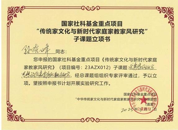 本网讯(通讯员:李彩平)近日,国家社科基金重点项目《传统家文化与新时代家庭家教家风研究》召开开题培训会。必赢大学生素质教育研究中心研究员孙晓峰教授作为子课题负责人,申报的子课题《优秀家风文化与思想政治教育有机融合研究》经专家组审核,成功获批立项。