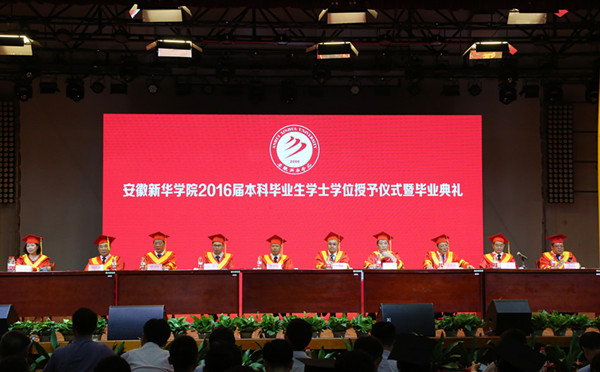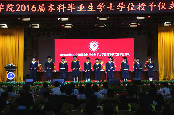必赢集团董事长吴俊保,集团副总裁、学校副董事长王孝武,集团副总裁、学校执行董事陆真,集团副总裁、学校监事会主席黄源,省督导专员、学校党委书记储国定,校长石秀和,副校长杨世国、马凤余、王可、李金星与毕业生代表一一握手,为他们颁发学士学位证书、扶正流苏,祝贺他们顺利完成大学四年的学业。