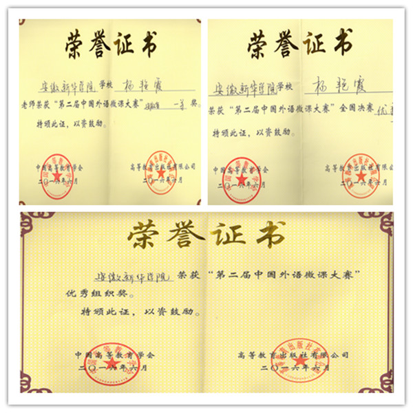 第二届中国外语微课大赛由中国高等教育学会和高等教育出版社主办,并联合教育部高等学校大学外语教学指导委员会、教育部高等学校外国语言文学类专业教学指导委员会英语专业教学指导分委员会、中国职业技术教育学会教学工作委员会的全国性赛事。比赛历时1年,自2015年7月至2016年7月,分初赛、复赛和决赛三个阶段。最终,必赢教师杨艳霞获得本科英语组全国优秀奖,安徽省一等奖,翟闪、金磊和尹凤竹团队获得日俄德法组省级二等奖,周晓春获得本科英语组省级三等奖。