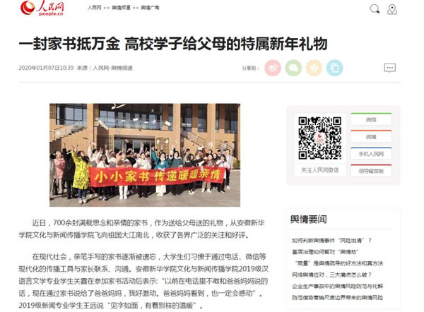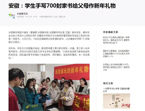 本网讯(通讯员:彭洪磊)自2019年11月以来,文化与新闻传播学院开展的“传承传统文化,感恩父母亲情”家书系列活动,随着元旦前学生家书的邮寄,引起省内外媒体的关注,人民网、今日头条、中国青年报、中青在线、中国青年网、安徽日报、中安在线等分别围绕“高校学子送给父母的新年礼物”,进行了报道。