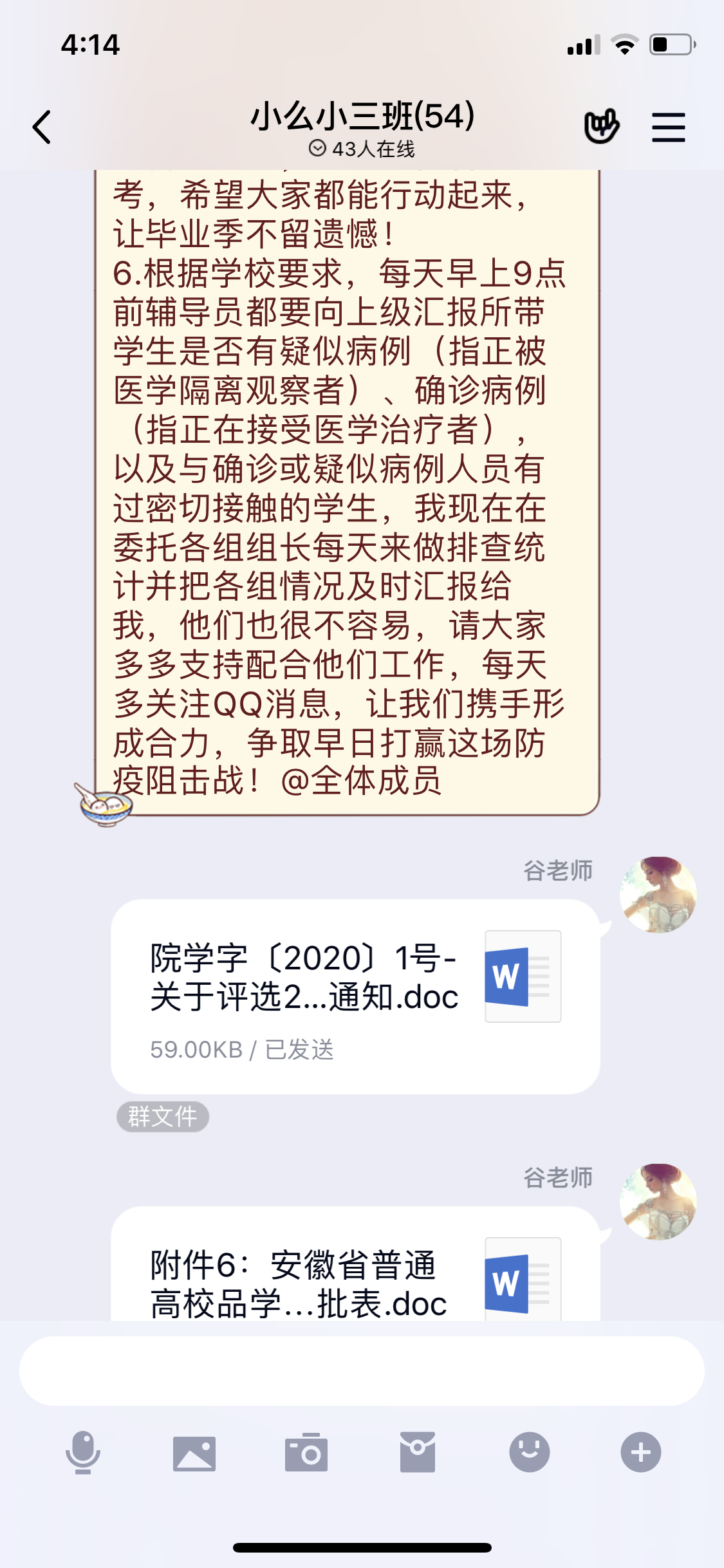 辅导员们虽然停下了出门的脚步,但没有停下对学生们的牵挂,在第一时间将学校有关疫情防控工作的文件、材料等通过班级群传达给学生,带领班干部收集整理官方信息,向学生讲解相关预防措施,严格落实疫情防控工作,做好跟踪排查与统计,密切掌握学生及家庭情况,随时收集整理学生动态,并积极传达教育学生掌握疫情防控知识。在积极做好延迟开学的相关工作安排,也提醒学生们安排好在家相关学习事宜及网络平台学习相关课程,做到开学推迟、授课及时,停课不停学。