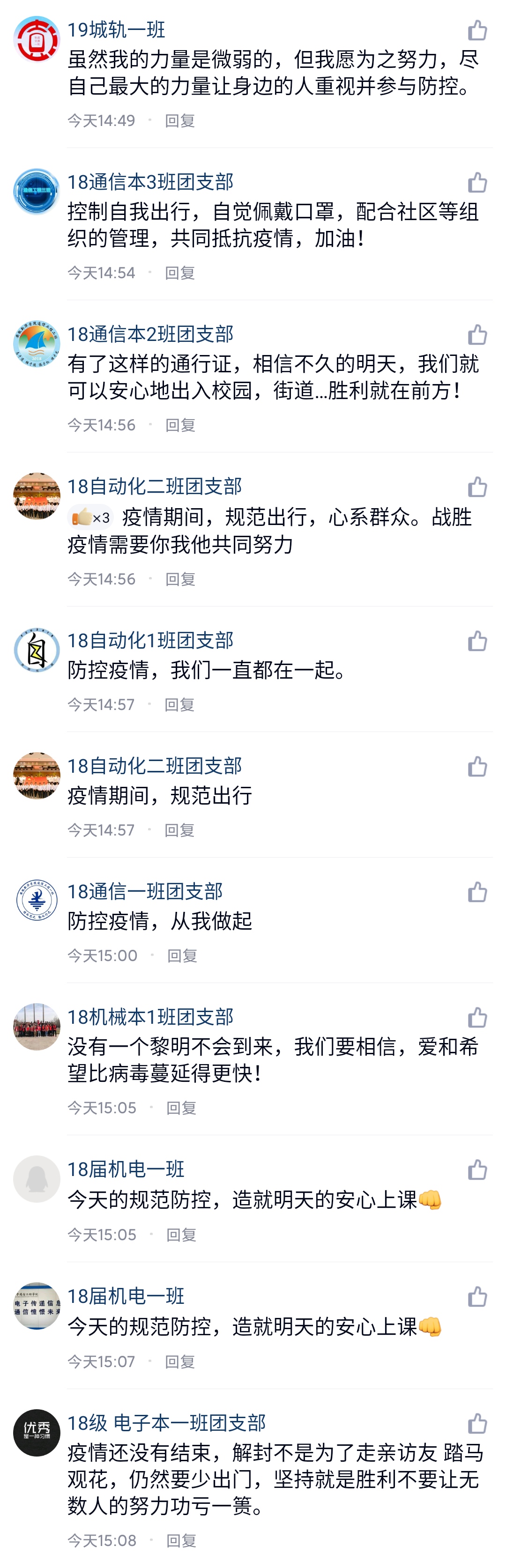 活动一经发布,各支部成员以各班级官Q以及学院官Q作为宣传点,积极响应号召晒出自己的通行证,并用自己的形式进行打卡。同时此次活动也吸引了广大团员青年热情参与,有的留言说:“虽然我的力量是微薄的,但我愿为之努力,尽自己最大的能力让身边的人重视并参与防控”。体现了大家对实施限制通行的理解和支持,通行证是在为坚决打赢新冠肺炎阻击战,坚持“外防输入、内防扩散、严防输出”的原则背景下产生的,在这个特殊的时刻它代表着国家打击疫情、全民共同抗击疫情的决心,它虽用严格的管理规范限制居民出行,但体现了全国上下团结一致打击疫情的坚定信念。