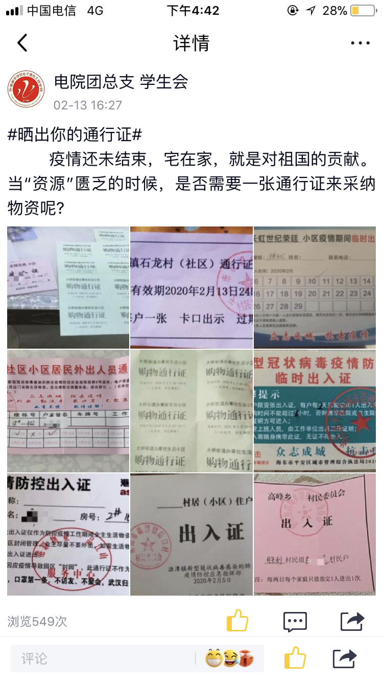 本网讯(通讯员:杨宏)自然和历史都告诉我们,没有一个冬天不会过去,没有一个春天不会到来。2020年突如其来的新冠肺炎让全民陷入了困扰和危机。在全国各地都因为疫情延长假期,须依靠通行证出入时,为了响应国家政策,鼓励学院学子在防疫抗疫中严格执行国家相关防疫规定,电子通信工程学院团总支于2月10开始带领各支部进行“晒出你的战疫通行证”线上活动。