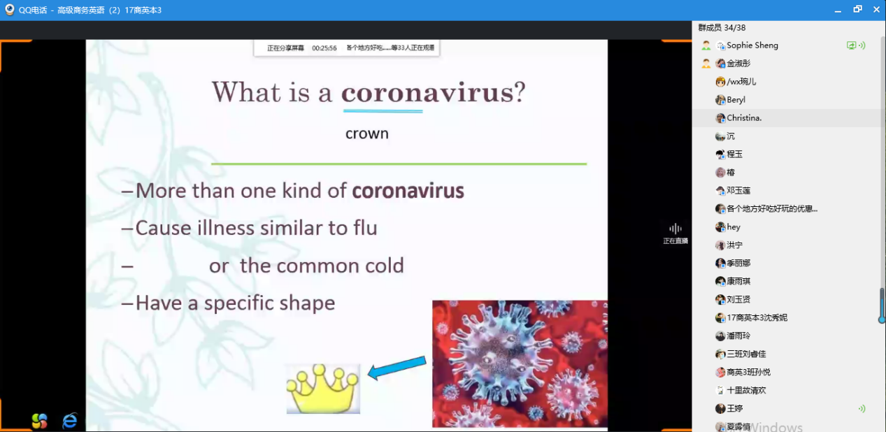 今天是线上教学第一天,各个授课平台教学过程流畅,师生互动环节设计合理,教学秩序井然有序,教学效果良好。结合当前的疫情情况,教师们还给学生补充了“新型冠状病毒肺炎”“疫情”“确诊病例”“疑似病例”的英文或日文表述,让学生感受到所学知识与现实生活密切关联。