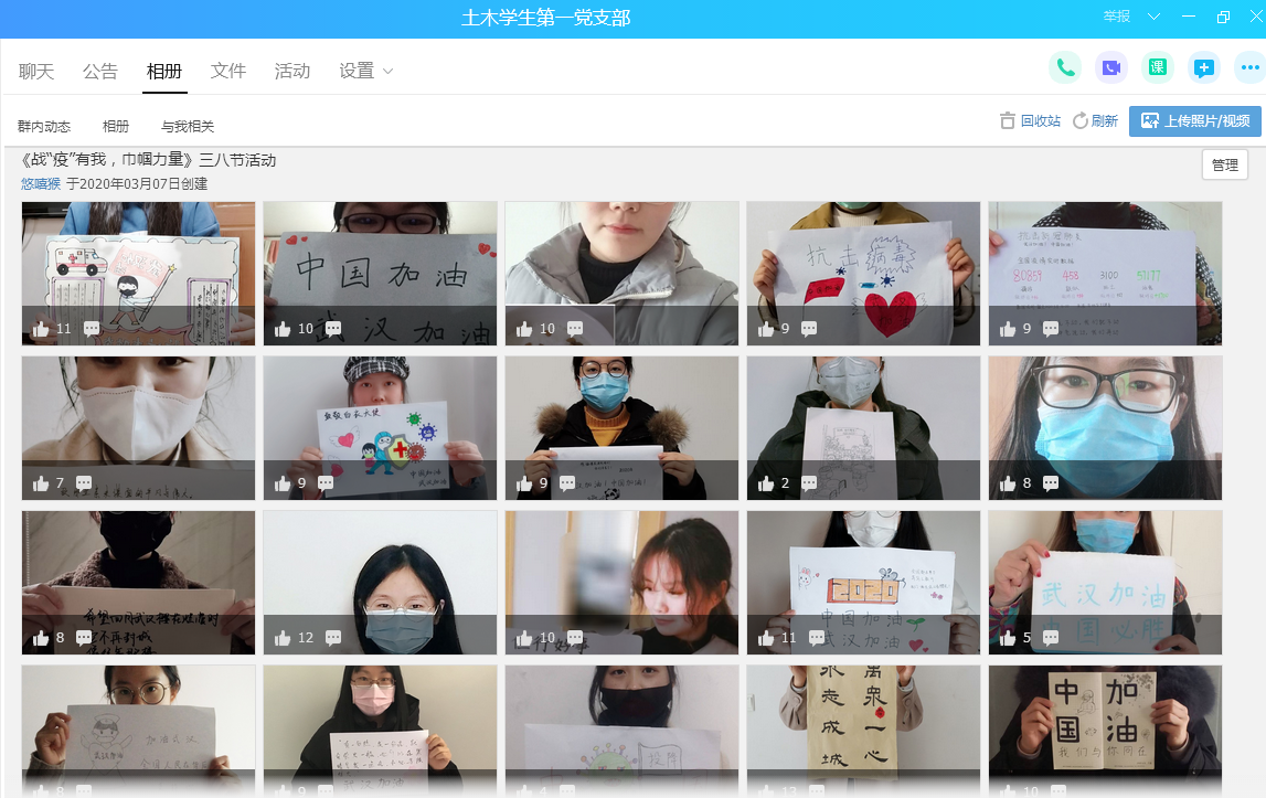 本网讯(通讯员:赵群)在全国万众一心抗击新冠肺炎疫情的关键时期,又值第110个“三八”国际妇女节来临之际,土木与环境工程学院学生第一党支部开展纪念“三八”国际妇女节活动,采用线上的方式,过别样的“云妇女节”,齐心协力为疫情防控献上满满正能量。