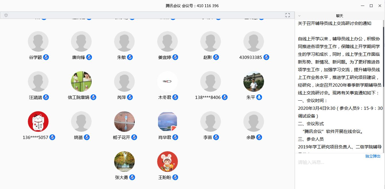 此外,会议还就线上开学一周以来,学工人员深入班级课堂、开展主题班会、线上团学工作、就创业指导、心理咨询、线上教学存在问题等各项工作进行深入交流,为顺利推进线上开学各项学生工作做好保障。