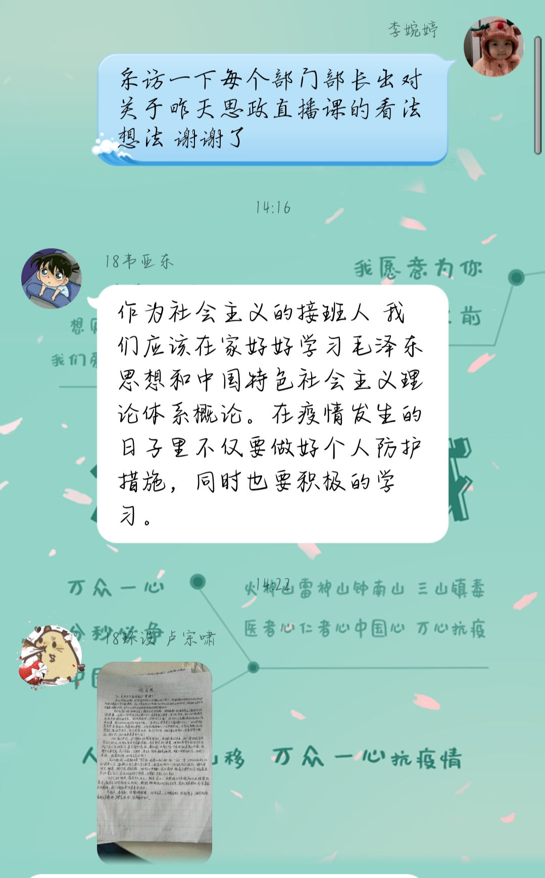 本网讯(通讯员:黄梦)为贯彻落实教育部社科司关于组织“全国大学生同上一堂疫情防控思政大课”的通知精神与要求,3月9日下午艺术学院组织师生通过网络平台观看课程直播,课程结束以后,艺术学子掀起热议“思政大课”的热潮,艺术学院团总支积极搭建青年发声平台,通过在线采访的形式,对部分同学做了学后感采访。