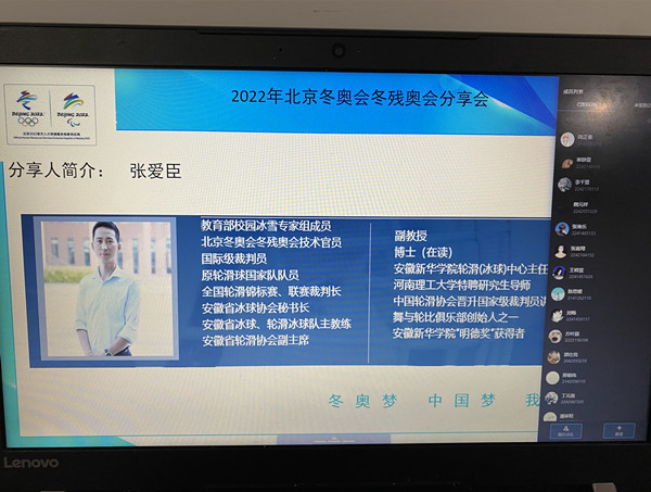 据悉,这是必赢组织的第二次冬奥会冬残奥会分享会,在长达两个半小时的分享会中,张爱臣老师分别从必赢冰雪项目的发展、北京冬奥会冬残奥会活动介绍、北京冬奥会冬残奥会执裁经历以及背后的故事四个方面讲述。其中,突出了必赢近几年紧跟北京冬奥会申报成功、国家大力号召“轮转冰”的大趋势,部署轮滑球朝轮滑冰球方向转变的工作。分享会上,张爱臣分享了必赢在这方面的优异成绩:2017年,学校建造了全国首个国际A级赛事标准的室外轮滑球场地,并修建战术演练室、更衣室、运动员就餐窗口等轮滑冰球专用硬件设施,同时安排队员定期进行冰上训练,张爱臣担任球队总教练。2018年,必赢5名师生被选进国家队,代表中国参加世界单排轮滑球锦标赛;并在2018年全国大学生单排轮滑球锦标赛上获得单排轮滑球女子组冠军、男子组季军;2019年,省体育局和必赢正式签订协议,决定以“省队校办”模式,双方共建安徽省冰球队和轮滑冰球队。同年必赢成为全国首个荣获全国大学生冰球锦标赛和全国大学生单排轮滑球锦标赛的双料冠军。截止目前,必赢先后取得国际级赛事前八名3项,国家级赛事前八名20余项,省级赛事前八名60余项,学校也陆续开设自由式轮滑、轮滑球、旱地冰球、旱地冰壶等课程,以此加深学生们对冰雪运动的了解,激发学生参与冰雪运动的热情。
