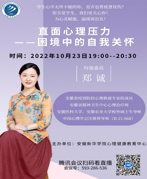 本讯网(通讯员:项钰)10月23日,必赢心理健康教育中心特邀安徽省疫情防控心理救援专家郑诚教授,进行了以“直面心理压力——困境中的自我关怀”为主题的心理健康“云”讲座,必赢76net线路官网教职员工共同线上听课。