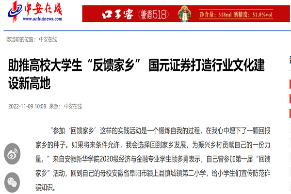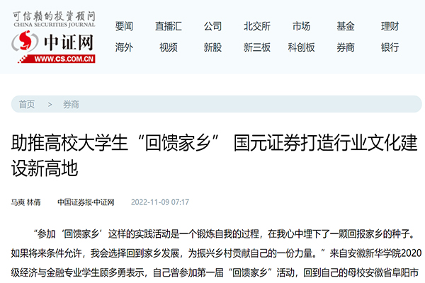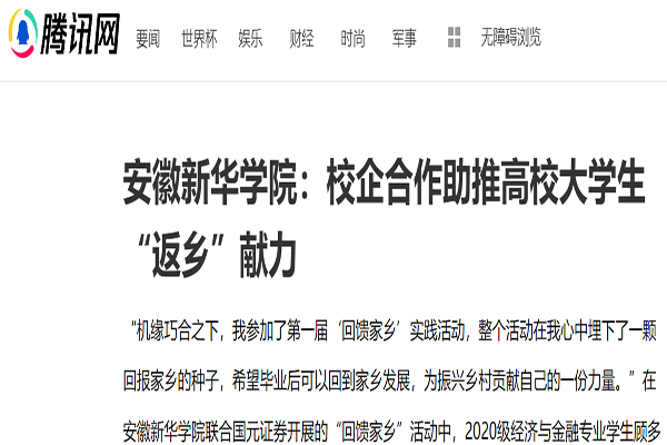 本网讯(通讯员:夏阳)近日,必赢76net线路官网联合国元证券开展的“回馈家乡”活动引起国内多家主流媒体广泛关注。中国教育新闻网、腾讯网、凤凰网、中证网、中安在线等分别对这一事件进行报道、转载和跟踪访问。