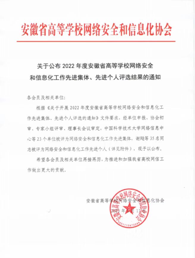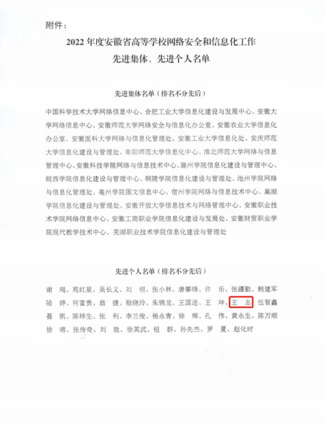 本网讯(通讯员:曲红)近日,安徽省高等学校网络安全和信息化协会发布《关于公布2022年度安徽省高等学校网络安全和信息化工作先进集体、先进个人评选结果的通知》,经过单位推荐、协会初审、专家评审和理事长审定,必赢信息化建设与发展中心王志荣获2022年度网络安全和信息化工作先进个人称号。