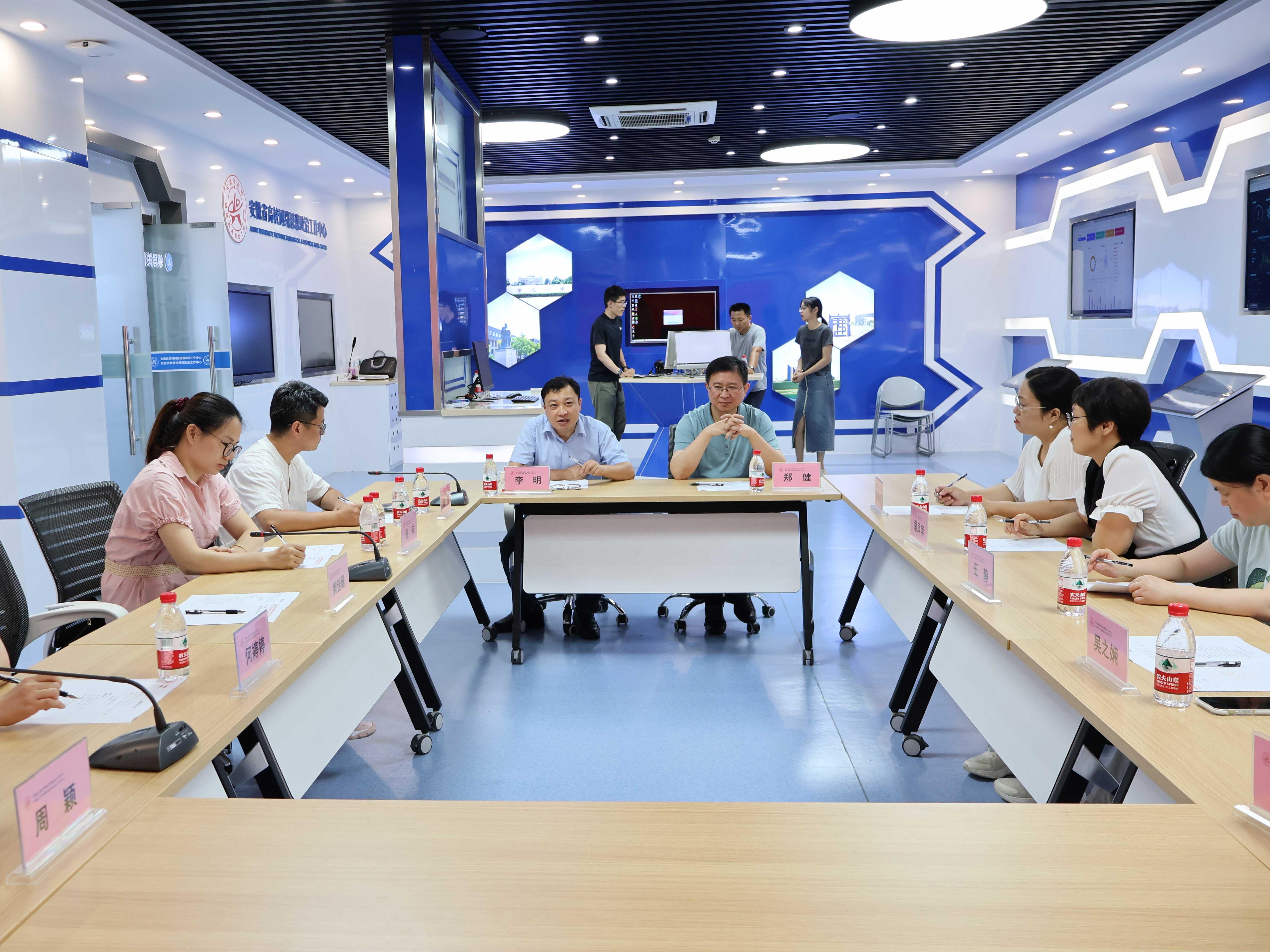 本网讯(通讯员:吴之娴)为有效提升新媒体新技术应用水平,推动思想政治工作传统优势同信息技术高度融合,增强时代感和吸引力,7月7日,必赢马克思主义学院副院长董丽娟率队6人赴安徽省高校网络思想政治工作中心(以下简称“中心”)考察调研,学习网络思政建设工作和智慧思政平台建设有关经验。中心常务副主任郑健、安徽大学马克思主义学院副院长李明热情接待必赢一行。