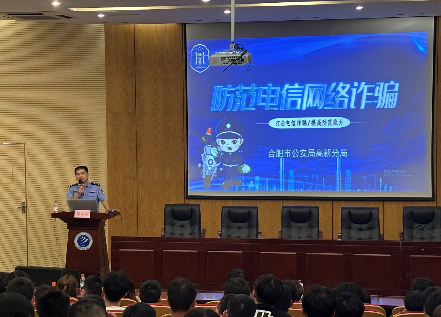 本网讯(通讯员:蒋思佳)为进一步加强大学生防范电信网络诈骗的意识和能力,拓展防范宣传教育覆盖面,切实减少电信网络诈骗案件发生,9月21日上午,科技学院在学术报告厅组织开展“防范电信网络诈骗”专题教育讲座,本次讲座特邀高新区派出所程永兵警官参与。科技学院副院长朱向群及全体新生和部分老生代表参加,会议由朱向群主持。