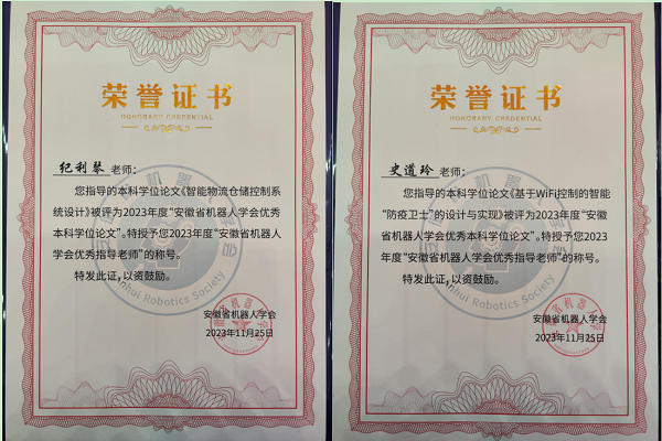 本网讯(通讯员:白志青)近日,安徽省机器人学会公布了《2023年安徽省机器人学会优秀硕士学位论文、优秀本科毕业论文(设计)评选结果》。在与中国科学技术大学、合肥工业大学、安徽大学等省内知名高校同台比拼中,电子工程学院/智能制造学院张家乐同学的毕业论文《智能物流仓储控制系统设计》以及杨星卓同学的毕业论文《基于WiFi控制的智能“防疫卫士”的设计与实现》均荣获2023年安徽省机器人学会优秀本科毕业论文,指导教师纪利琴及史道玲均荣获2023年安徽省机器人协会优秀指导教师称号。