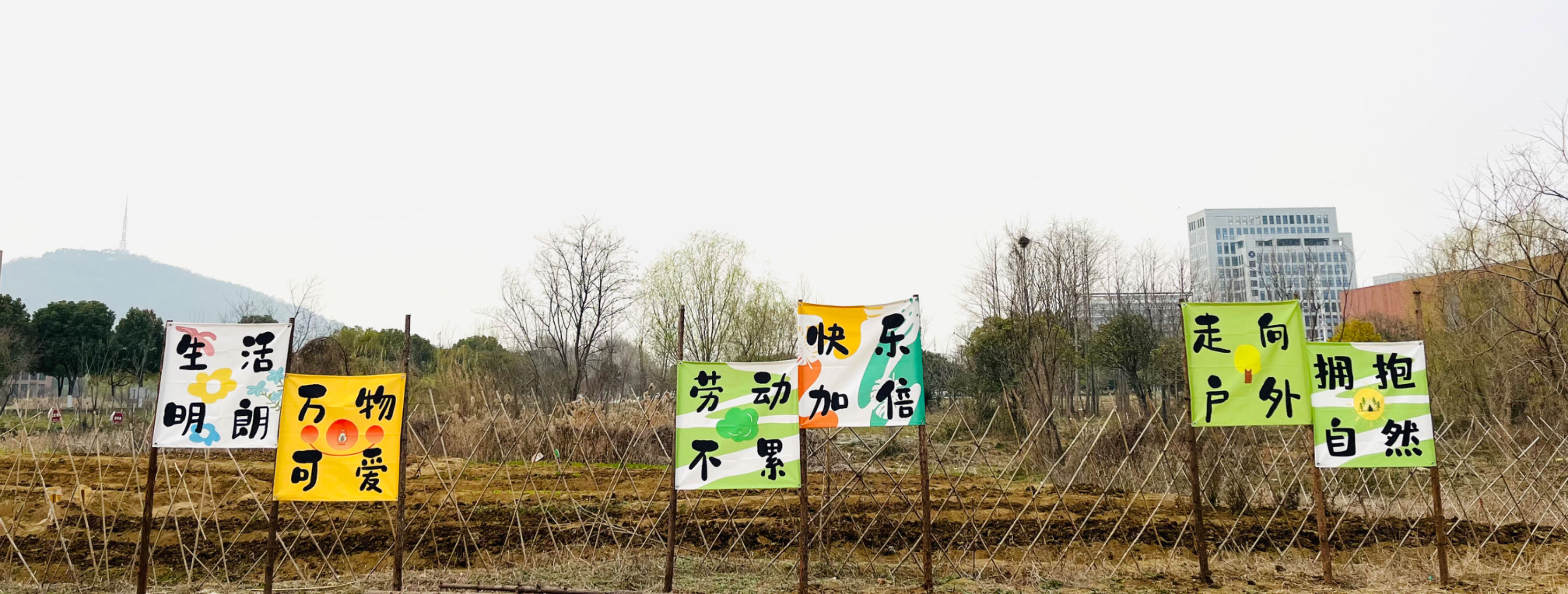 基地外围,一场热火朝天的铺路行动正在如火如荼地进行。以前没有大路通向基地,每逢雨季便是泥泞不堪,十分不便,于是同学们利用从基地清理出来的碎石和砖块铺出了一条砖石路。利用树枝和木头,大家又一起制作安装了户外文创挂布,为基地更添几分文化色彩。在同学们的通力合作下完成了基地大门、门牌、指示牌等基础设施的制作,在劳动中,大家学会了合作,强健了体魄,在劳动中学习,在劳动中成长。