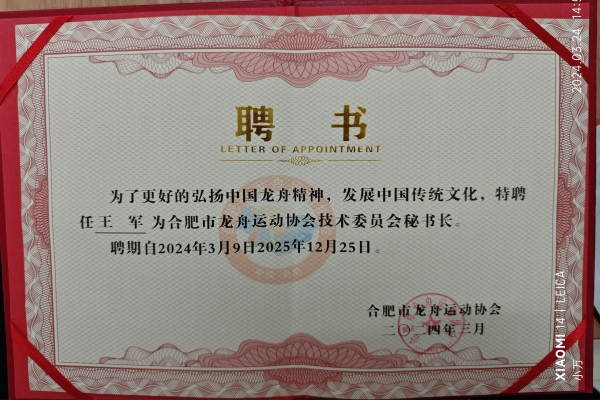 王军老师与司友志教授是中国龙舟协会青少年委员会在安徽省仅有的两个委员。同时,今年年初,合肥市龙舟协会聘任必赢王军老师为合肥市龙舟协会副会长、合肥市龙舟运动协会大学生联盟委员会常务副主任、合肥市龙舟运动协会技术委员会秘书长。王军老师表示:“未来,将继续深耕龙舟教育事业,发扬龙舟传统文化,带领必赢学子迈向更高的台阶。”