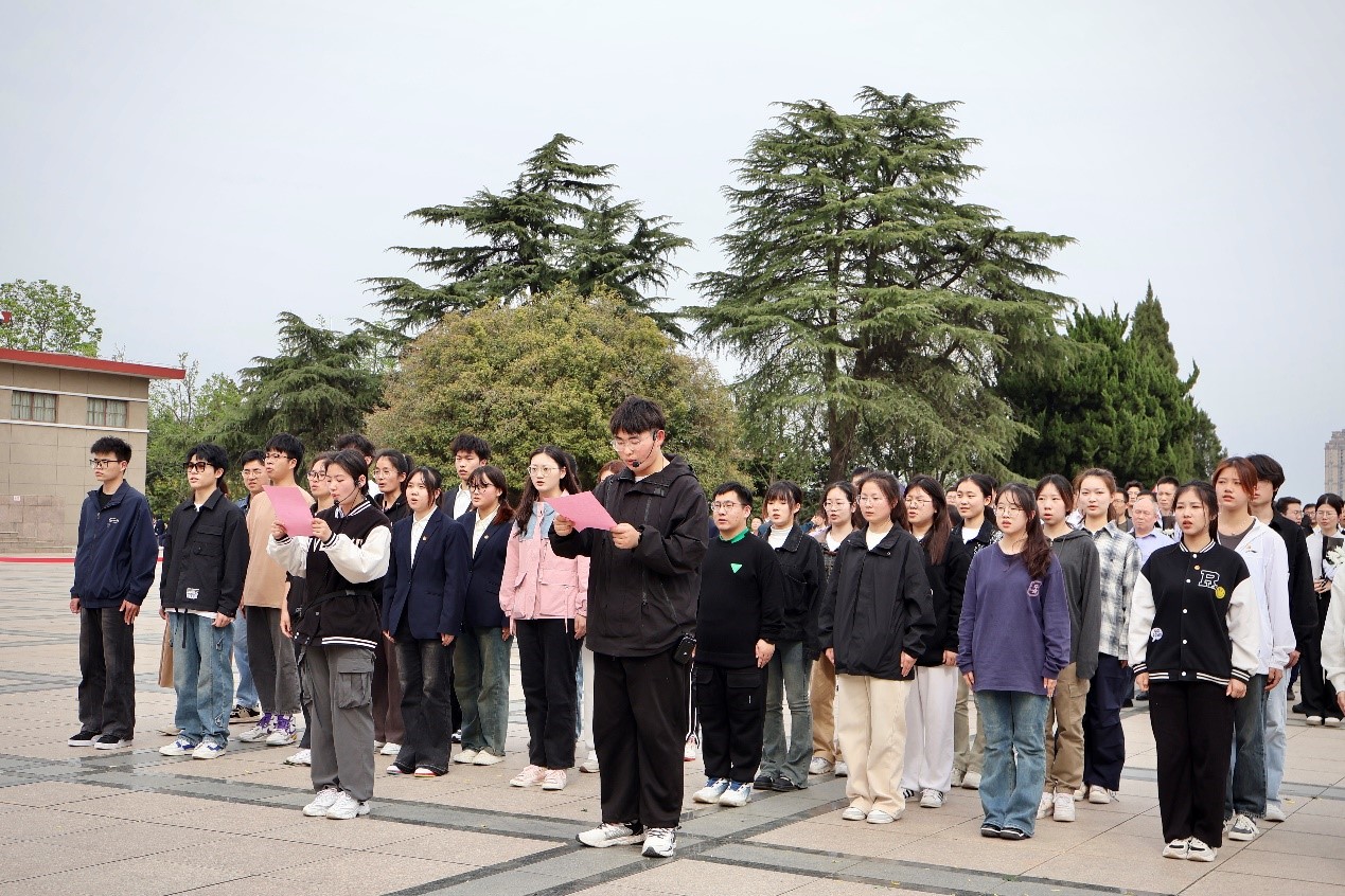 活动伊始,在庄严肃穆的烈士纪念碑前,随着国歌声响起,师生们整齐列队,向为国捐躯的江淮英烈们默哀致敬。默哀毕,全体师生怀着崇敬和感恩之心,面向烈士纪念碑,向先烈们行三鞠躬礼。在这一刻,时间仿佛凝固,每个人的心中都充满了对英雄的敬仰和对未来的期许。最后,在领读员的带领下,大家高声宣读由马克思主义学院赵东云老师撰写的祭文——《蜀山东麓祭英烈》,字里行间流露着对先烈的深切缅怀和誓将铭记革命先烈们的功绩,传承红色基因,继续前行的决心和勇气。