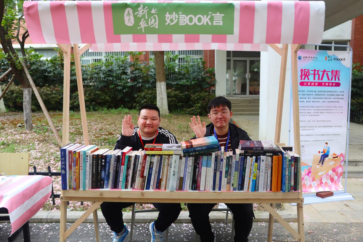 与去年不同,今年的活动以“妙Book言”为主题,让这场“春日约会”的“书香味”更浓。下午1点30分,书香市集刚“开张”,图书盲盒、旧书置换的摊铺前便人头攒动,成为学生们的流连忘返之地。