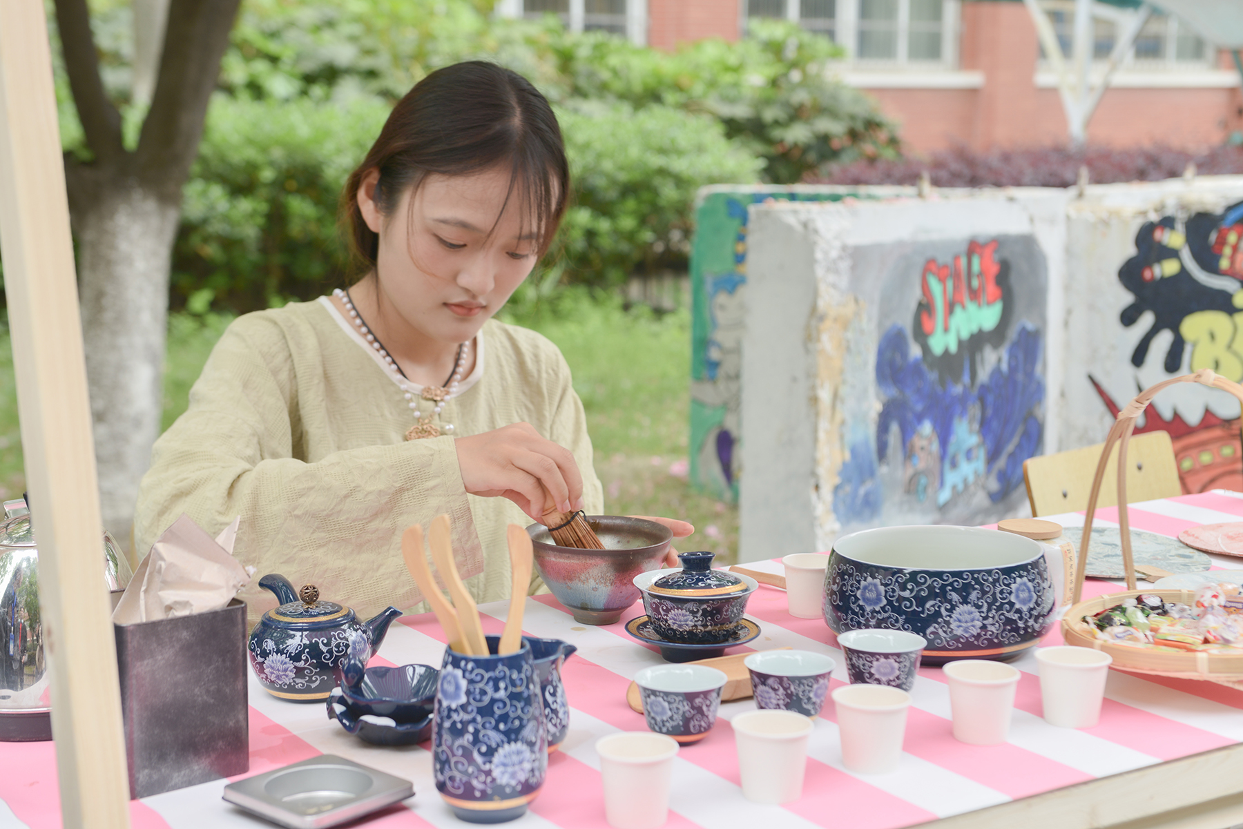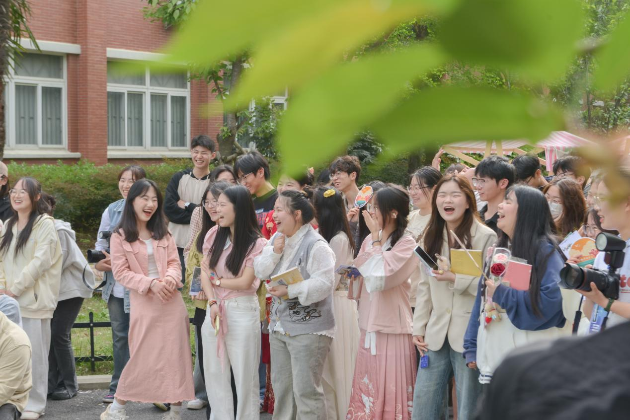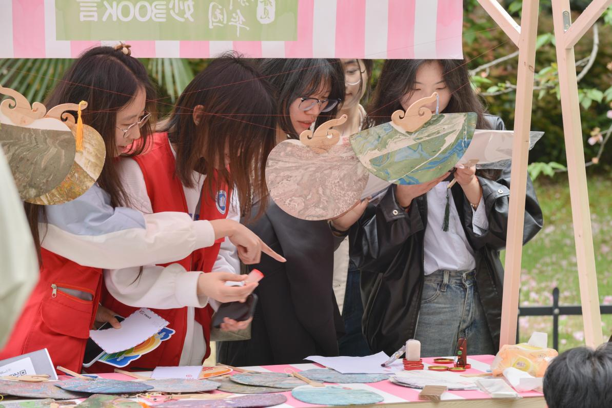 在现场,师生们除了能感受到书香市集浓郁的的书香味,文韵雅集的各类传统文化体验也引来学生们驻足和参与。现场搭建古风建筑模型,沉浸体验茶百戏,绘制团扇、书签……各类学生社团还将飞花令、射箭、投壶、古风桌游等多种传统文化体验活动“搬”到了樱花树下。