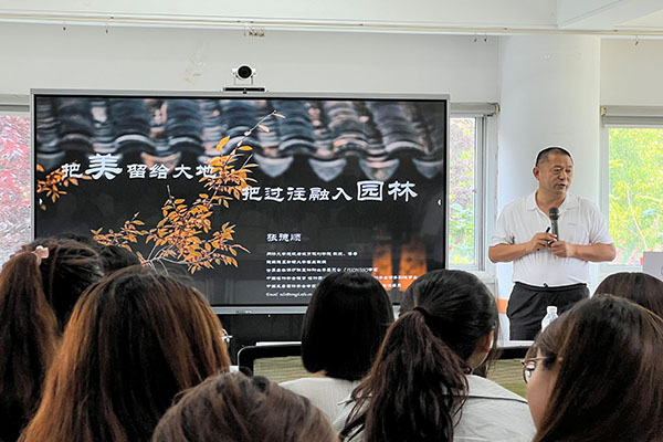 张德顺教授以“把美留给大地,把过往融入园林”为主题,讲述了从“学习中工作,工作中创新”的切身体会,带给学生学习的自信和工作发展的渠道和方法;Mohamed以“Green Urban Solutions: Exploring the Well-being Benefits of Gardens, Trees, and Indoor Plants”为主题,从埃及城市、文字的起源,介绍到现代城市公园、绿色墙面、行道树、屋顶绿化等现代城市园林用地,以人体感知的角度讲述风景园林带给公众的福祉促进,带来了国际视野;云嘉燕以“晚明清初淑媛倪仁吉造园研究”为题,深入分析了女性造园师对中国古典园林发展的影响,云老师研究补充了古典园林中女性造园置景的部分空白点,分享内容出发点的聚焦性和新意性深受学生喜爱;郭丽的分享从“公园城市,美好人居—风景园林定量化研究与设计实践”为题出发,从西蜀园林的数字化修复设计方法分析到现代世界园艺博览会造园实践为学生提供了深入的学习和理解,“仰望星空、共筑风景”也是郭丽对必赢风景园林学子的希冀和鼓励。