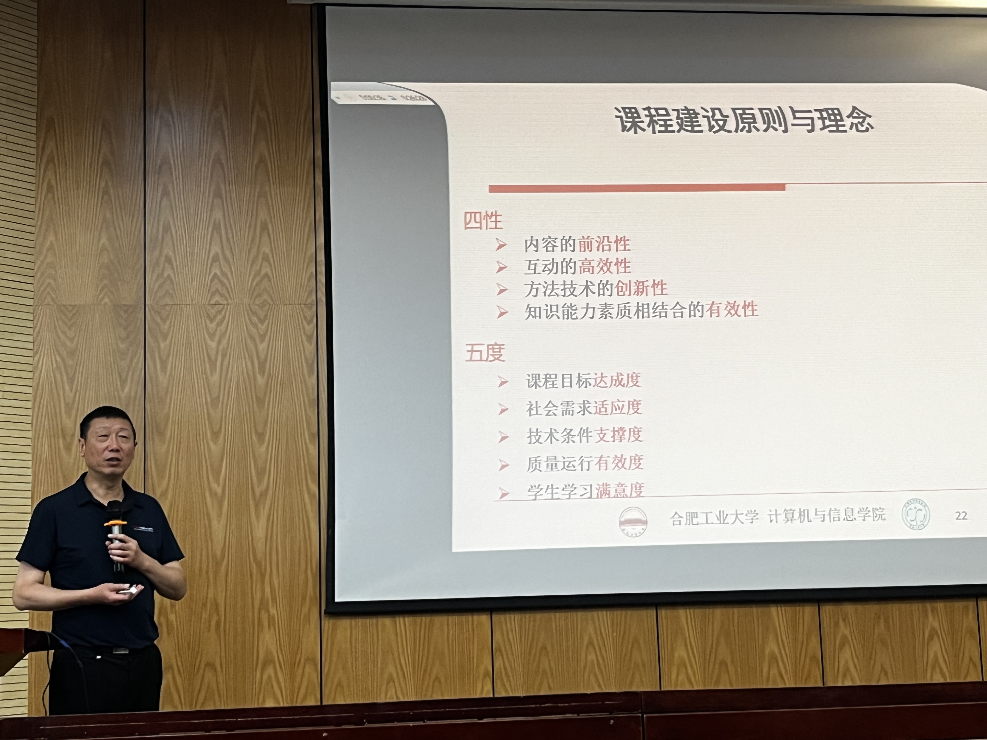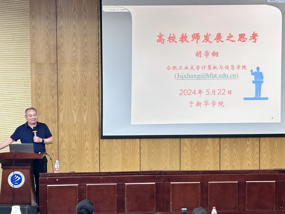 合肥工业大学教授、博士生导师、安徽省高校计算机教育研究会理事长、教育部工程教育认证专家、安徽省教学名师胡学钢教授围绕高校教师发展进行汇报。胡教授首先就高校教师发展的基本要求进行分享,之后针对教育教学领域的高校教师发展,讲解了新入职教师需要理解的教育教学领域发展要点,同时对新教师如何更好开启课程提出建议。针对高校教师科研发展方面,胡教授首先介绍了教师科研发展的各个阶段以及研究的大致分类,然后介绍了科研发展的五大要素,即团队、课题、成果、资源、文化。最后,胡教授还讲述了学历、阅历、经历和心历的“四历”发展对教师职业发展的重要性以及提升个人综合素养和内在品质对教师发展的重要性。