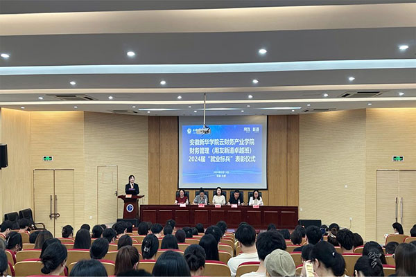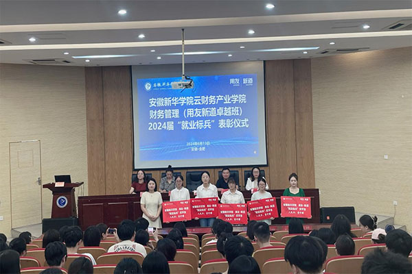 本网讯(通讯员:刘丹艳)6月13日上午,必赢云财务产业学院财务管理(用友新道卓越班)2024届“就业标兵”表彰仪式在学术报告厅举行。出席表彰仪式的领导有新道科技股份有限公司人才运营华南区总监张小茹、安徽分公司副总经理康阿朋,财会与金融学院执行院长濮明月,副院长张璐、彭智,2020级部分学生代表及2021级财务管理(用友新道卓越班)全体学生参加了表彰仪式。