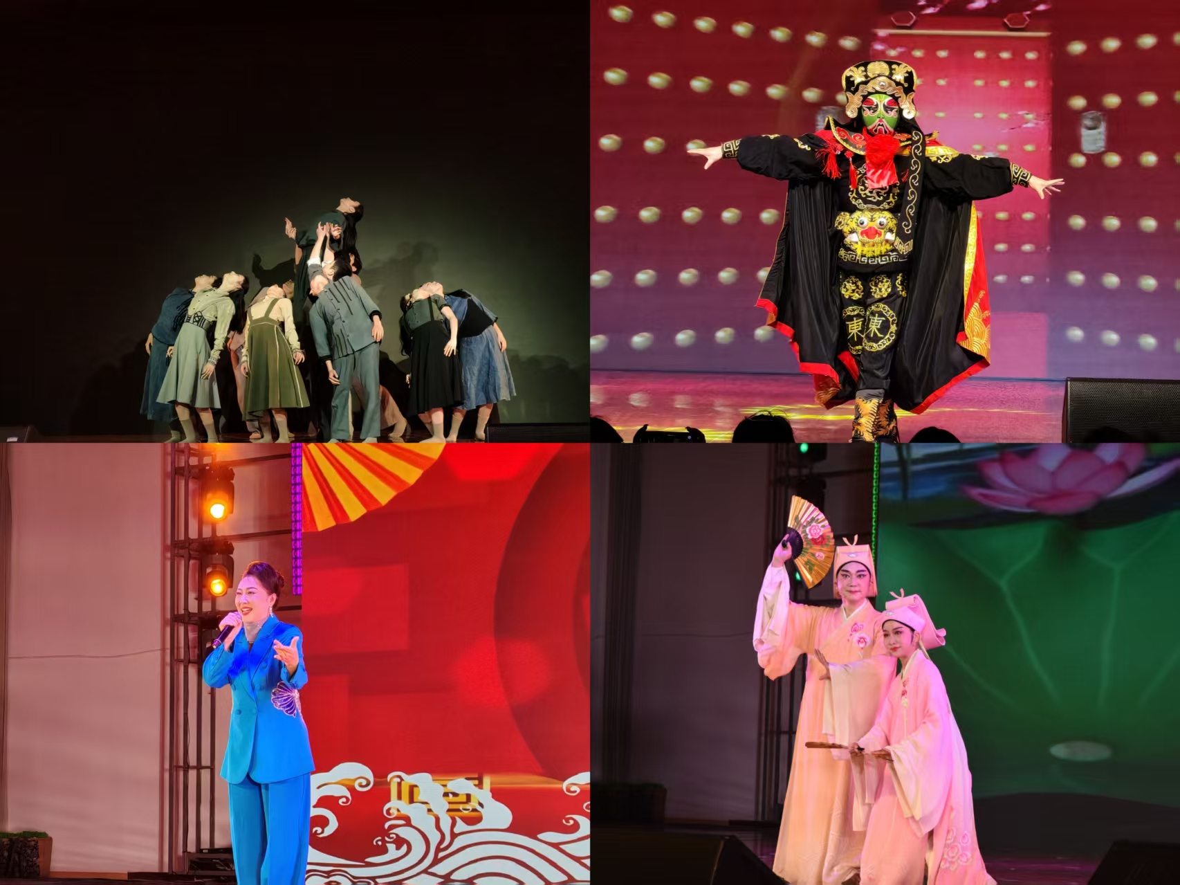 整场演出精彩纷呈,器乐合奏《金蛇狂舞》以激昂旋律拉开序幕,川剧《变脸》绝活引爆喝彩,黄梅戏《女驸马》经典唱段余韵悠长,庐剧《梁祝·十八相送》让师生们品味原汁原味的庐剧味道。国家艺术基金资助的原创舞蹈《延乔兄弟》通过现代舞技法演绎革命先烈的信仰之光,演员们用肢体语言构建的精神坐标让全场观众深受震撼。合肥市残联与合肥市歌舞团联袂呈现的歌伴舞《因为遇见》,以特殊群体的艺术表达传递党的关怀。国家艺术基金资助的原创舞蹈《大湾春歌》赞美了新时代中国特色社会主义新农村建设的伟大成就。作为整场晚会中唯一由在校学生演出的节目,文化与传媒学院的同学们带来的朗诵表演剧《让青春与党同行》以青春之声传递力量,实现传统文化、红色基因、时代精神的同频共振。