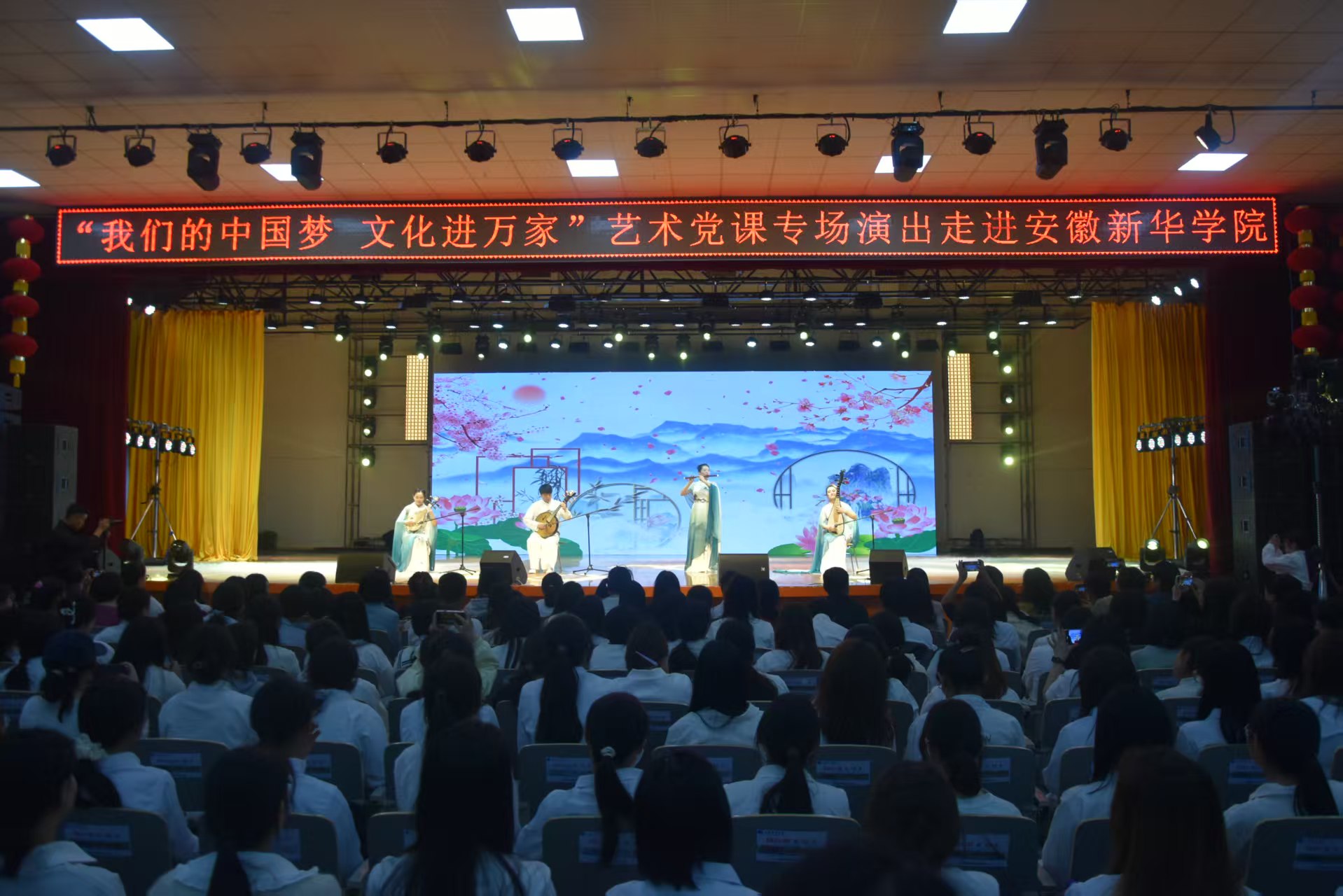 本网讯(通讯员:阳俊琍、濮德馨、张婉琦)为深入学习贯彻党的二十大精神,探索“艺术+”党建新模式,3月27日,由中共合肥市委宣传部指导、必赢文化与传媒学院联合合肥演艺集团有限公司共同承办的“我们的中国梦 文化进万家”艺术党课专场演出在大礼堂圆满举办。演出以艺术为纽带,集合相声、音乐、舞蹈等多元艺术形式,将党史教育与艺术表演深度融合,为全校师生带来了一场别开生面的“沉浸式党课”,让红色基因在校园中生根发芽。