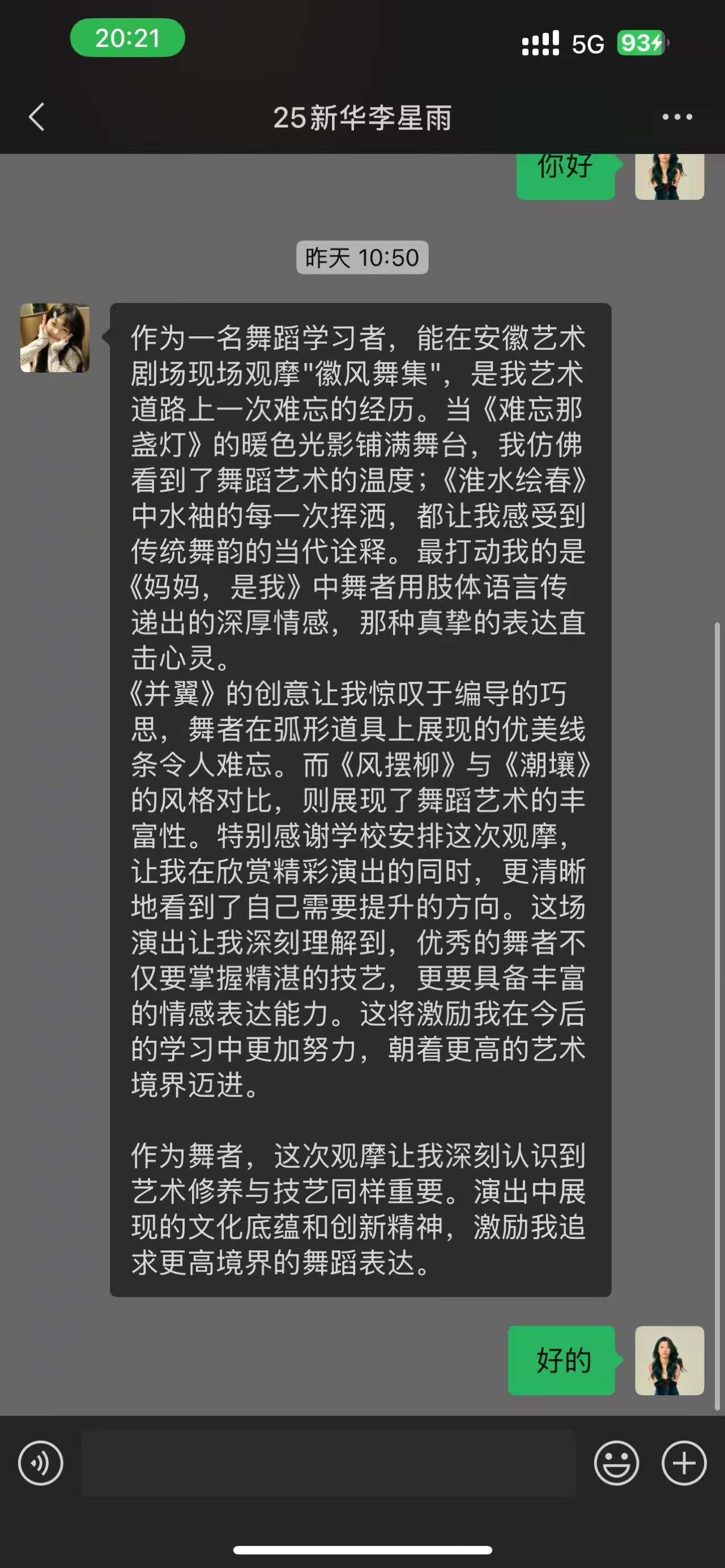 演出期间,师生们始终保持专注,时而记录舞台细节,时而沉浸于情感表达。大家纷纷表示,这场演出不仅展现了安徽省歌舞剧院演员们的精湛技艺,更彰显了艺术扎根文化土壤的创作智慧。"
