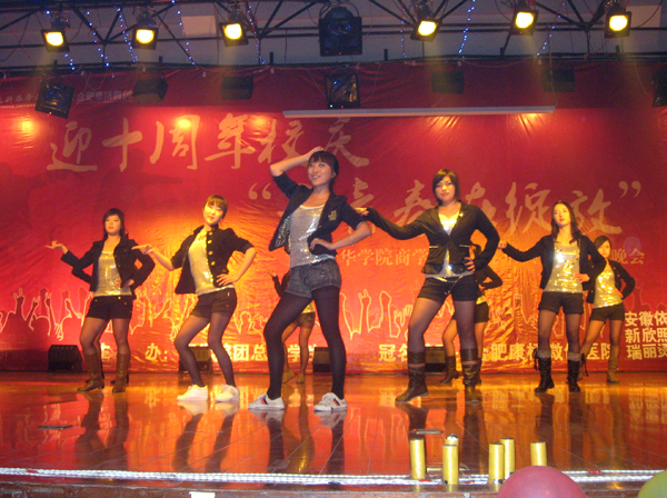节目现场,一支动感热辣的日本爵士舞引爆全场;商学院余静老师一首深情的《一帆风顺》送给即将毕业的学子以及在座的每一位观众;本场晚会的一大亮点无疑是商学院学生自编自导的节目,首先带来的FASHION SHOW揭起了晚会的第一轮高潮;武术协会的武术表演《霍元甲》上演别样精彩,武术表演与歌曲配合得天衣无缝,大家看得目不转睛;小品《如此应聘》中的六位男生搞怪滑稽的舞蹈雷倒了现场每一位观众;最后,一支轻快活泼的舞蹈《GEE》为本场晚会画上了一个圆满的句号!