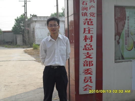 8月31日,无为县委组织部举办了“第三批选聘高校毕业生到村任职对接欢送会”,在对接会上陈鹏同学代表无为县的13名村官做了精彩的表态发言。9月2日,他带着深深的荣誉感、责任感和使命感来到村部——无为县石涧鎮范庄村,开始了正式的大学生村官工作,任村委会书记助理。他的具体工作内容,即全面负责村“为民服务全程代理”工作,协助村“两委”做好其他各项工作。为民服务全程代理工作是帮助农民群众解决实际问题的重要工作之一,而作为一名新上任的大学生村官,村里一开始就让他参与此项重要的工作,是村“两委”对他的信任,对他的培养,而他也立志将以饱满的热情投身到农村工作中去。