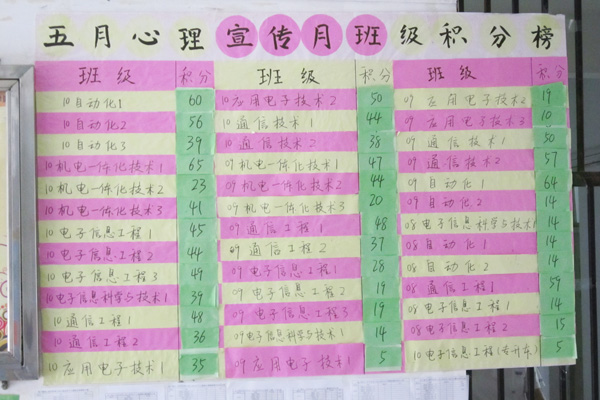此次活动成果显著,各班级积极参与,广大学子充分发挥想象力,设计出主题鲜明,风格迥异,创意独特的各项板报作品。有的将板报设计为一张明信片,有的将心理知识与专业知识相结合进行设计,有的将板报融入到整个教室的设计中……最终2010级通信工程1班和2010级应用电子技术2班获得并列第一。