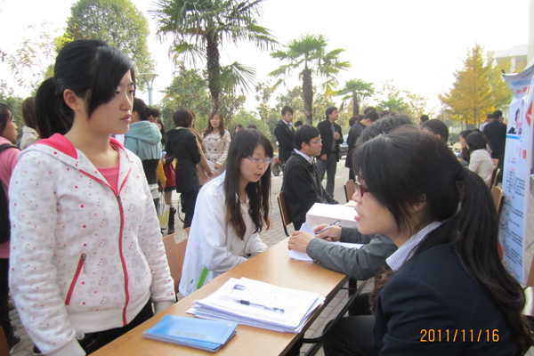 11月16日下午,包括安徽城市职业学院等九家企事业单位汇聚在文化与新闻传播学院楼下,进行2012届毕业生专场招聘会,来自文化与新闻传播学院和其他兄弟院系500余名学生参加了招聘会。