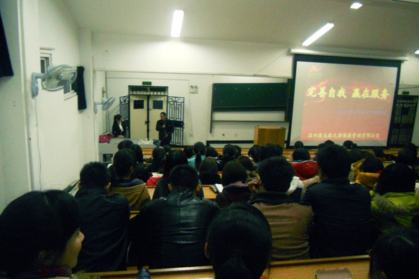 韩先生主要分析了90后大学生的就业心理现状,并对现场参会的部分学生进行了心理测验,理论与实践相结合,为参会学生进行就业心理分析与指导。韩先生还对温州德马康之源的企业文化作了简单介绍,并向在场学生伸出橄榄枝,欢迎大家前往他们企业参观实习。