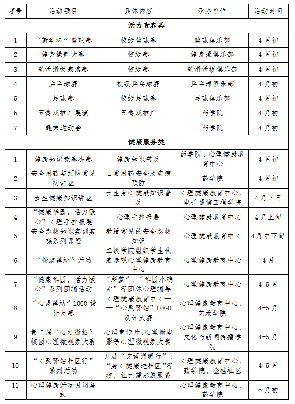 为进一步打造学生身心素质提升工程,普及健康常识,提高健康意识,践行健康理念,形成互助互爱和谐的人际关系,营造积极向上青春活力的校园氛围,校团委决定于4月启动“健康华园·活力文化节 ”系列活动,现将有关事项通知如下: