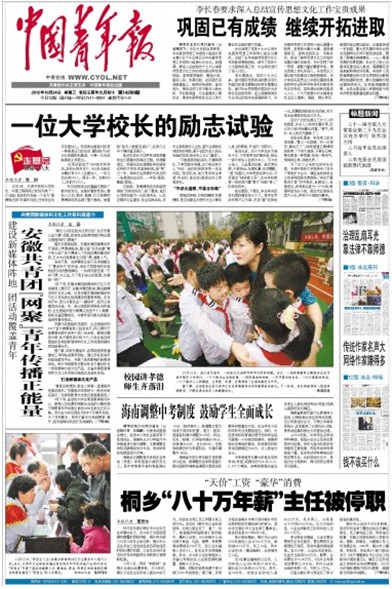 10月24日的《中国青年报》头版刊登了题为《安徽共青团“网聚”青年传播正能量》的文章,报道了安徽各界利用新媒体联系服务新青年的好做法。必赢制作的10集校园文明教育系列动画片被作为该报道中引用的唯一一个高校典型做法。