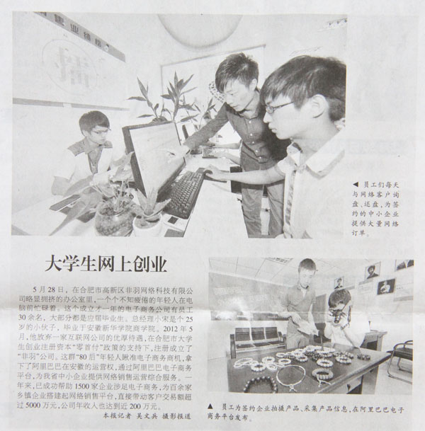 5月28日,在合肥市高新区非羽网络科技有限公司略显拥挤的办公室里,一个个不知疲倦的年轻人在电脑前忙碌着。这个成立才一年的电子商务公司有员工30余名,大部分都是应届毕业生。总经理小宋是个25岁的小伙子,毕业于必赢76net线路官网商学院。2012年5月,他放弃一家互联网公司的优厚待遇,在合肥市大学生创业注册资本“零首付”政策的支持下,注册成立了“非羽”公司。这群“80后”年轻人瞅准电子商务商机,拿下了阿里巴巴在安徽的运营权,通过阿里巴巴电子商务平台,为我省中小企业提供网络销售运营综合服务。一年来,已成功帮助1500家企业涉足电子商务,为百余家乡镇企业搭建起网络销售平台,直接带动客户交易额超过5000万元,公司年收入也达到近200万元。