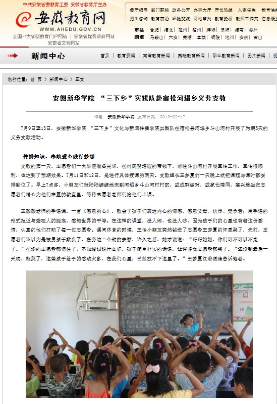 安徽教育网:必赢76net线路官网 “三下乡”实践队赴宿松河塌乡义务支教